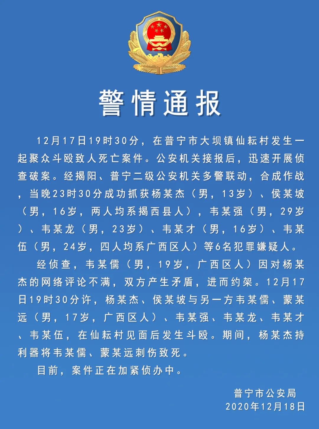 广东13岁少年刺死两人,警方通报:因不满网络评论斗殴,已被抓获