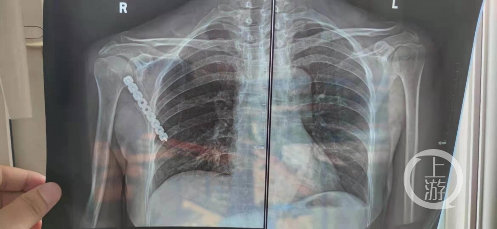 上游新闻记者注意到,舒女士左肩胛骨处被缝了13针,CT片显示,其右肩胛骨处安装了固定器械。