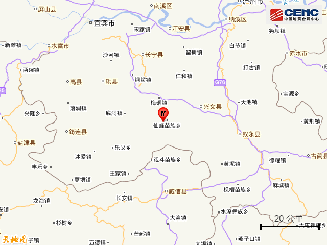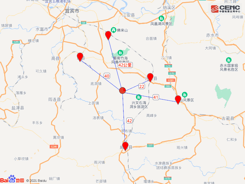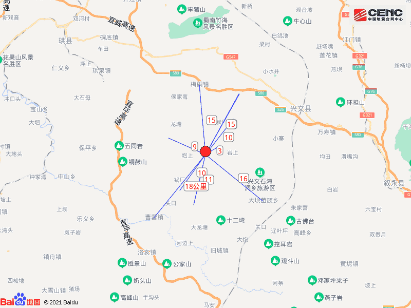 周边县城:震中距兴文县22公里、距珙县40公里、距叙永县41公里、距云南威信县42公里、距长宁县42公里,距宜宾市70公里,距重庆市211公里。