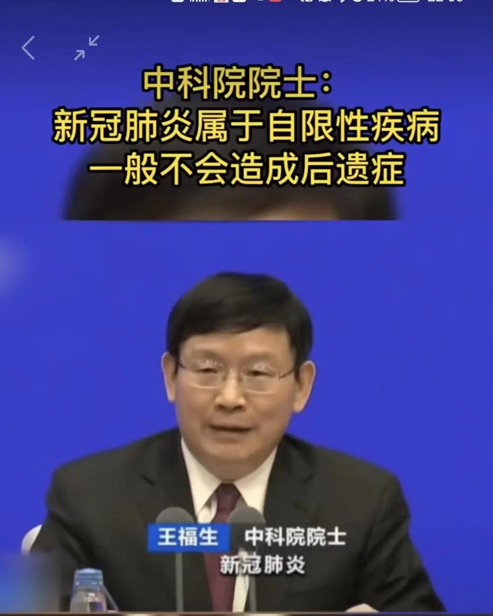 ▎ 2020年2月21日, 国务院应对新型冠状病毒感染肺炎疫情联防联控机制在国务院新闻办公室召开科技创新支撑疫情防控新闻发布会。中国科学院院士王福生就“新冠肺炎属于自限性疾病”的热点问题进行了解释。