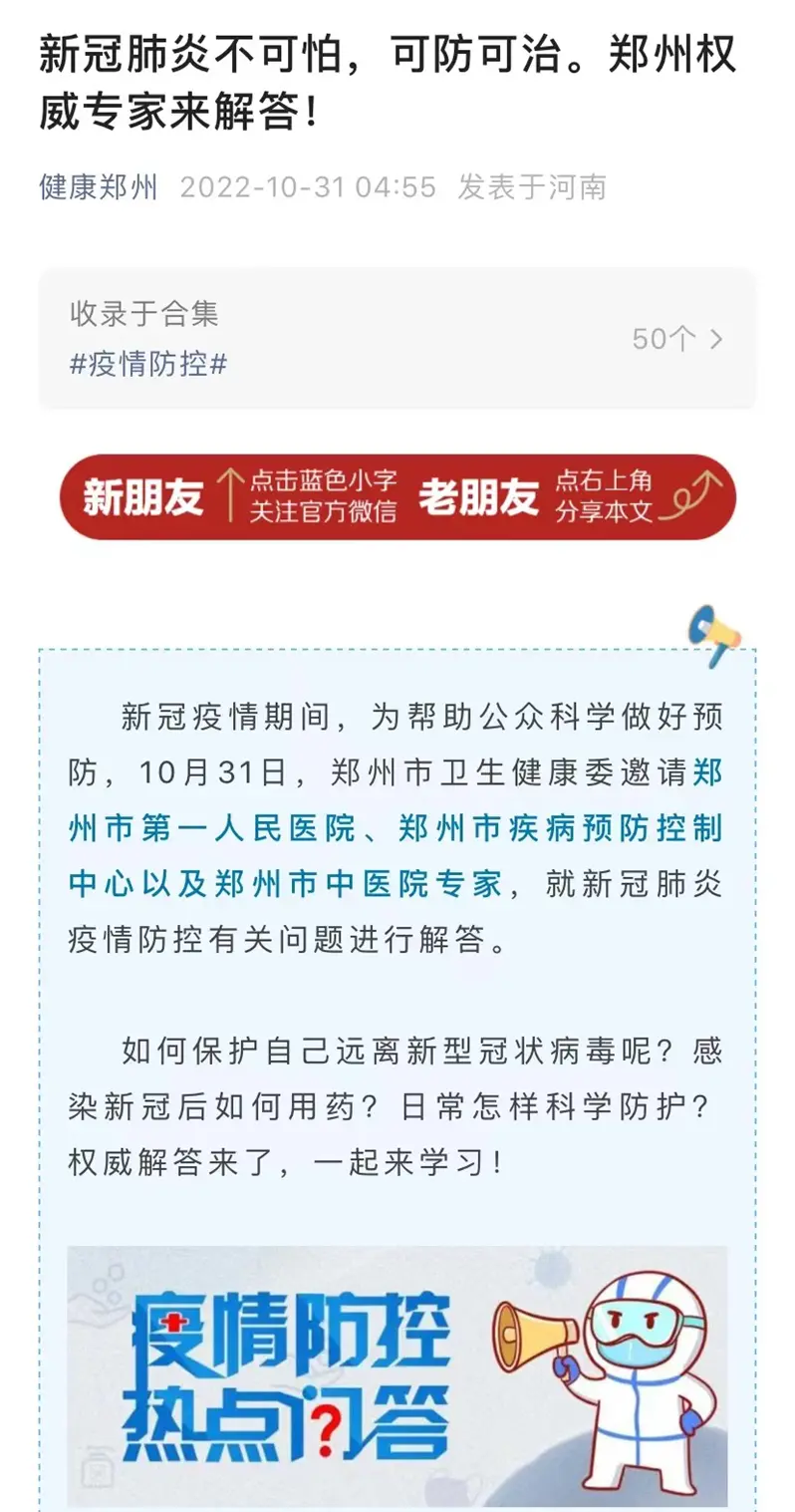 10月31日,郑州卫健委在“健康郑州”(郑州卫健委公众号)发表了一篇文章,标题是“新冠肺炎不可怕,可防可治。郑州权威专家来解答!”,而《大河报》《河南日报》等河南媒体,也发表了多篇文章,解释为什么新冠肺炎是自限性疾病。而这些文章,都在强调一点——大家不要过于惊慌。