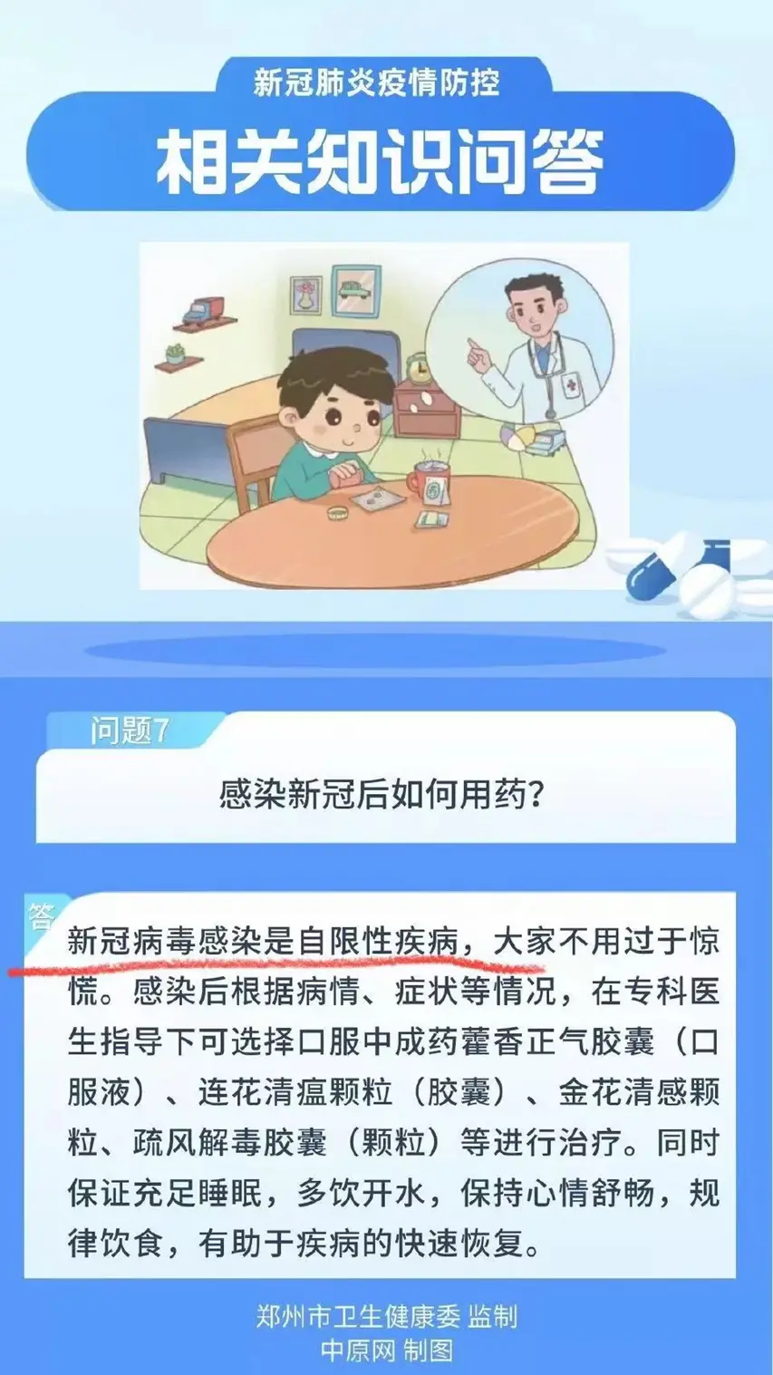 首先在传染病学上,“健康郑州”这篇文章说的大部分都没问题,关于病毒传播、如何防护、如何使用口罩、常见症状等说的都比较科学,也确实“可防可治”、“是自限性疾病”(注:自限性疾病,就是疾病在发生发展到一定程度后,靠机体调节能够控制病情发展并逐渐恢复痊愈。一般来说,在没有严重其他并发症的情况下,只需对症治疗或不治疗,如一些特殊的病毒感染、自身免疫性疾病等。常见的自限性疾病有:玫瑰糠疹、水痘、病毒性感冒、亚急性甲状腺炎 、轮状病毒肠炎等),这些都是客观的医学事实。