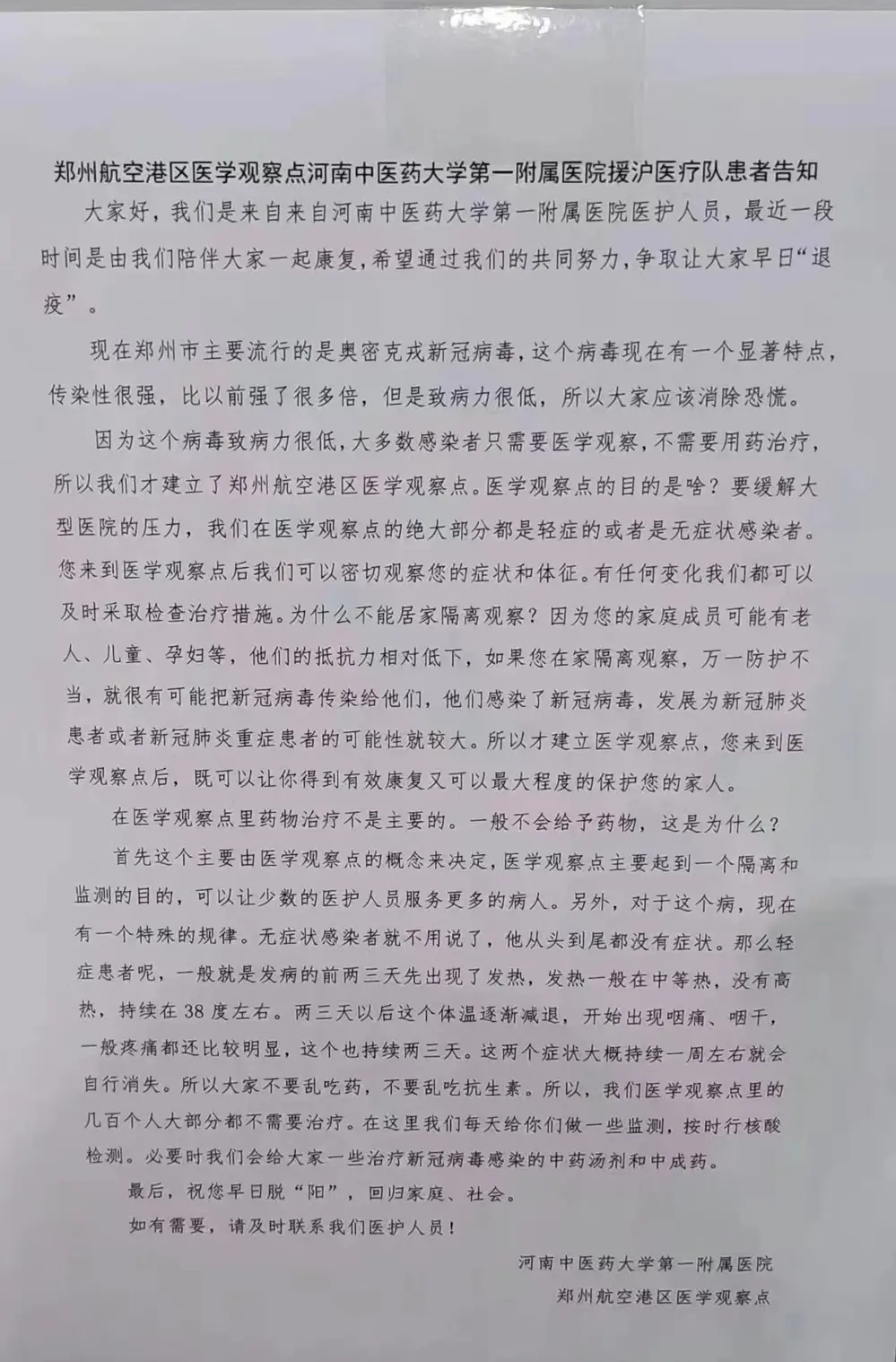 ▎ 郑州航空港区方舱内张贴的告示。关于目前病毒的传染性、致病力、临床表现和治疗方式,可以参看这个方舱医院医护人员的观点。这个告示指出:”奥密克戎新冠病毒现在有一个显著特点,传染性很强,比以前强了很多倍,但是致病力很低,所以大家应该消除恐慌。因为这个病毒致病力很低,大多数感染者只需要医学观察,不需要用药治疗,所以我们才建立了郑州航空港区医学观察点。医学观察点的目的是啥?要缓解大型医院的压力,我们在医学观察点的绝大部分都是轻症的或者是无症状感染者。”