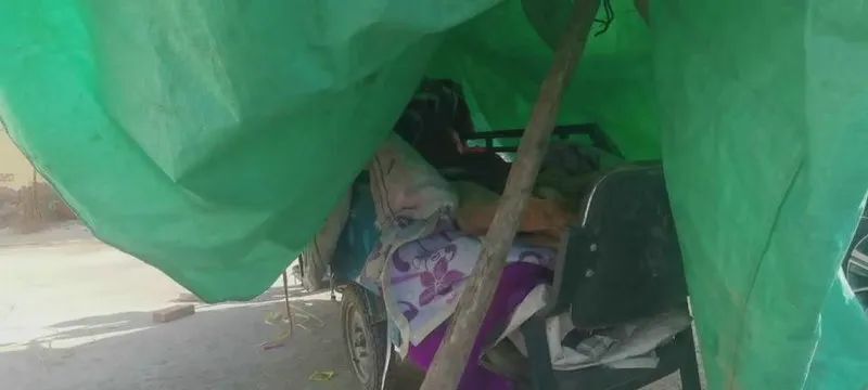 当地灾民在搭建临时帐篷时,想出了不少应急办法。其中一位村民将带拖斗的电动三轮车的后车斗,后搭一把椅子,上垫棉絮,再立一个人字架,上盖绿色塑料布,就搭成了一个可以不用睡在透骨凉的水泥地上的临时帐篷。村民称,这个帐篷可挤4人。
