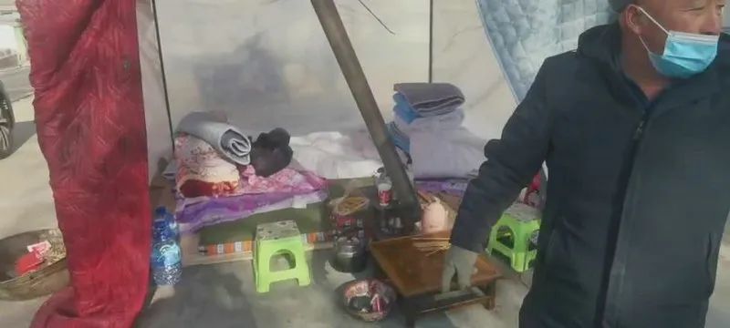 在救援部门的帐篷未到达前,一些灾民自己搭建了简易帐篷,展开自救。图中灾民躬身进出帐篷的原因是,其头部上方是家里搬出的燃煤烤火炉。该村民说,帐篷内虽然有烤火炉,但晚上仍然太冷,睡垫是一层棉絮和一层毯子,即使把电热毯一直开着,也感觉不到热。