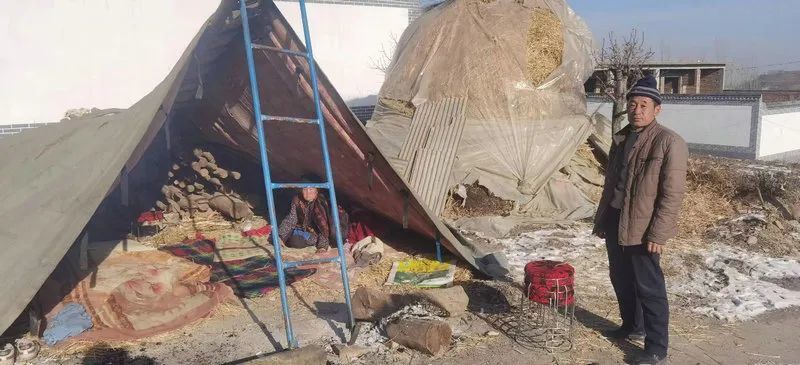 本次地震的非严重受灾区域的救援物资目前仍在进一步配送中,大河家镇梅坡村5社的马维军一家,在家门前的木堆前,用帆布搭建了一个简易的人字形帐篷,他们在水泥地上铺了一层大致2厘米厚的干草,垫上毯子,席地而睡。