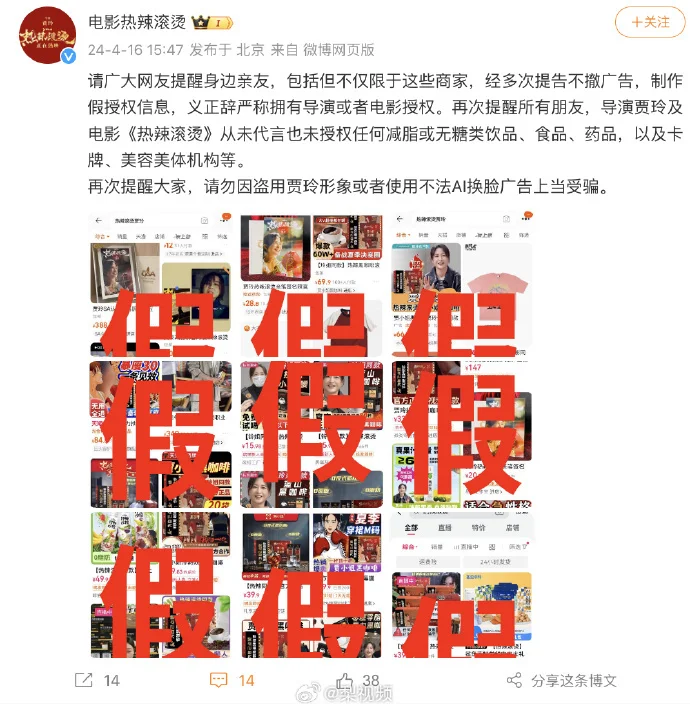 再次提醒大家,请勿因盗用贾玲形象或者使用不法AI换脸广告上当受骗。