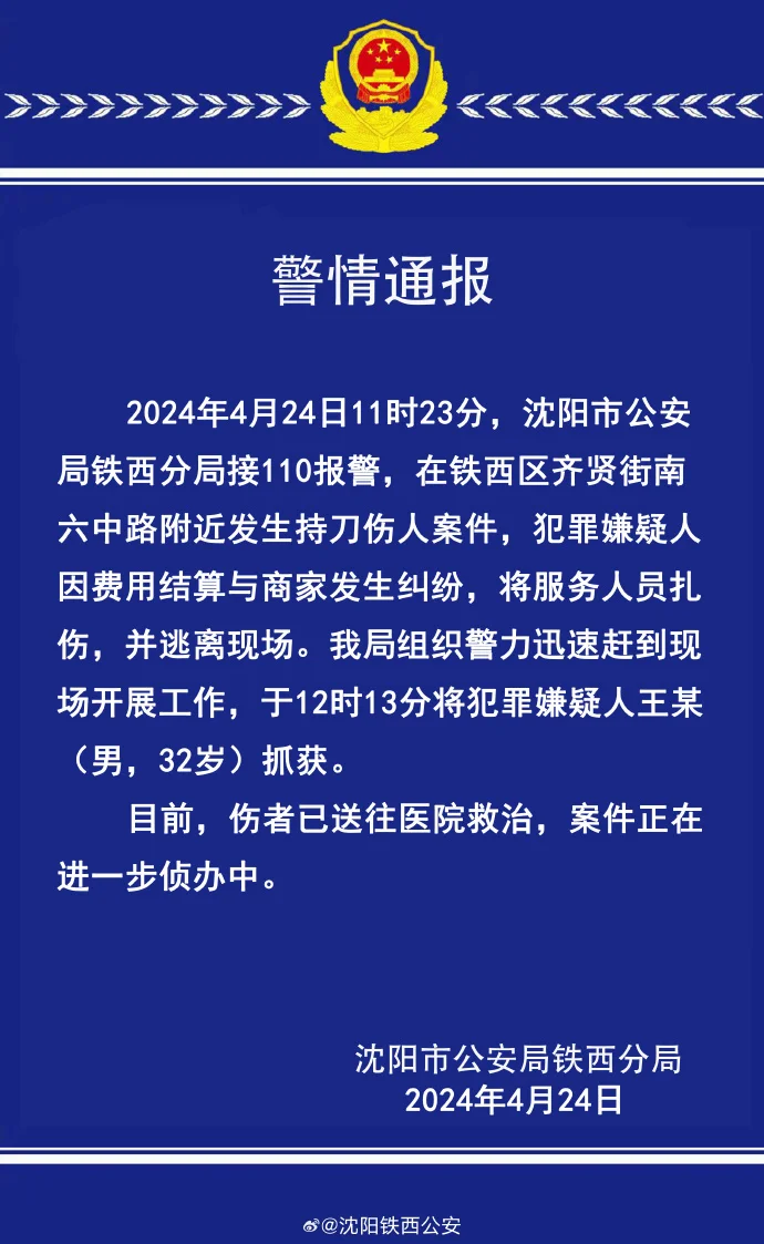 沈阳发生一起持刀伤人案,嫌疑人已被抓