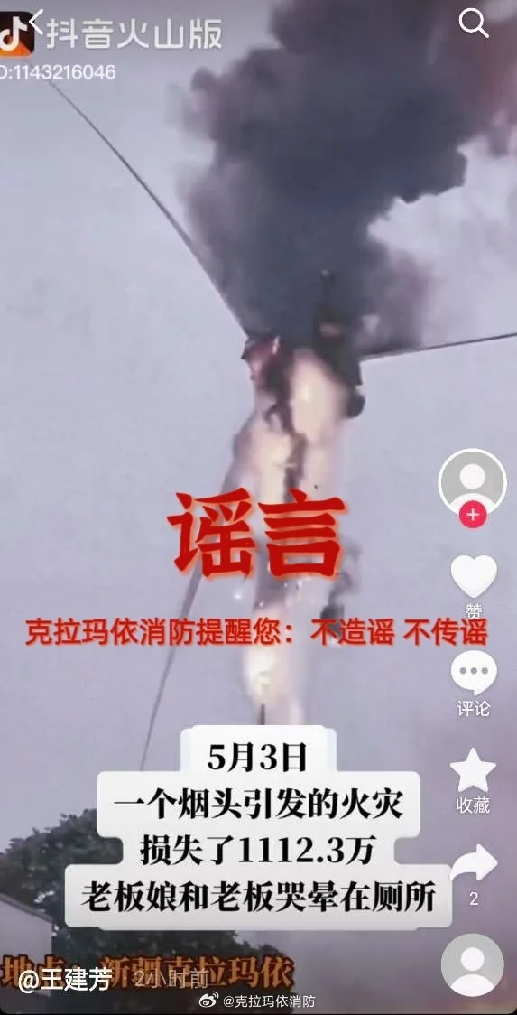 近日,有网民在互联网上发布“5月3日,一个烟头引发的火灾,损失了1112.3万,老板娘和老板哭晕在厕所”“5月3日,突发风力机着火,损失了1125.4万,老板娘和老板哭晕在厕所”的几段视频,视频文字标记地点均为新疆克拉玛依。视频发布后引起网民关注,克拉玛依市消防救援支队立即对视频内容进行核实。