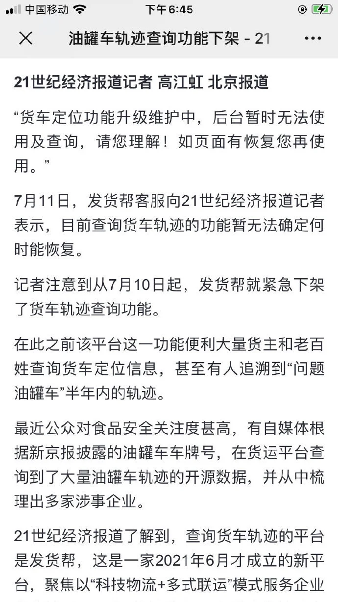 如果平台“发货帮”就是因为技术原因而暂停这项服务,老胡诚恳建议有关部门督促该平台加紧解决问题,重新开放油罐车轨迹查询功能,它的升级可以暂缓。如果下架该功能是受到外部力量的要求和干预所致,我想说,无论发出要求和干预的是谁,初衷是什么,其实际效果都是破坏我们社会的基本信任感,而且这一后果最终损害最多的将是官方公信力。所以说,有关部门需要迅速采取措施,推动上述查询功能的及时恢复。