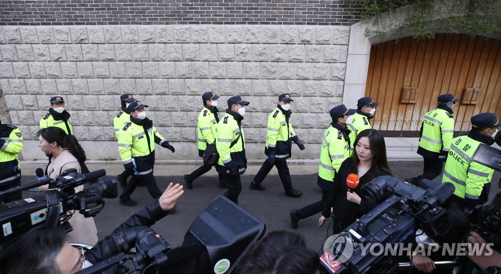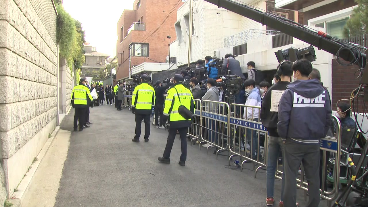27日早上,全斗焕住宅外,大批警力正在维持秩序。(韩联社)