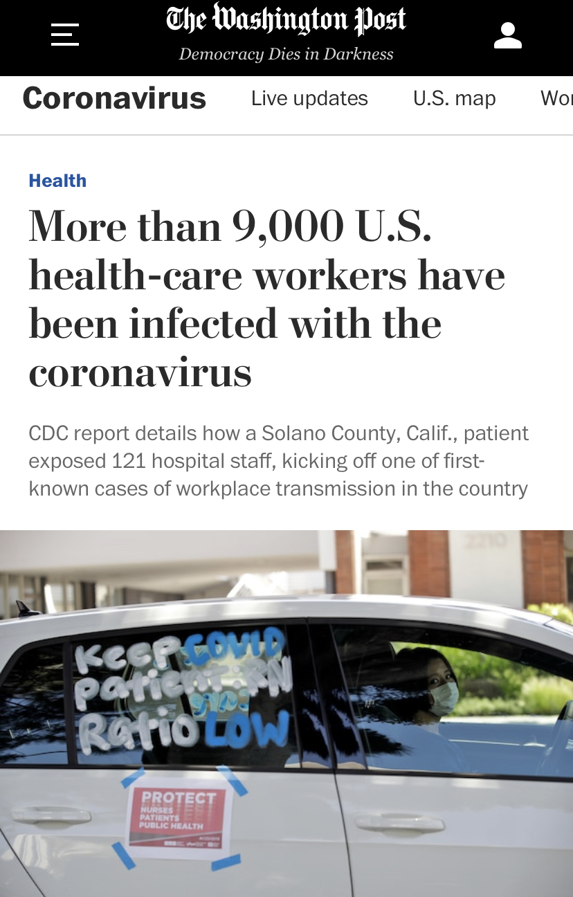 △《华盛顿邮报》报道,截至4月中旬,全美超过9000名医护人员确诊新冠肺炎