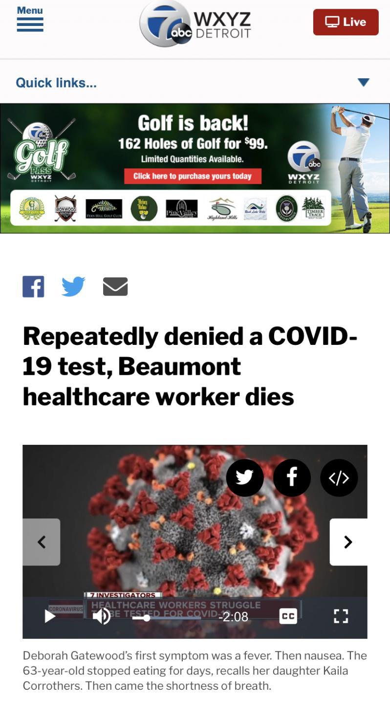 △ABC底特律报道,多次被拒绝COVID-19检测的医护人员,终致死亡 |