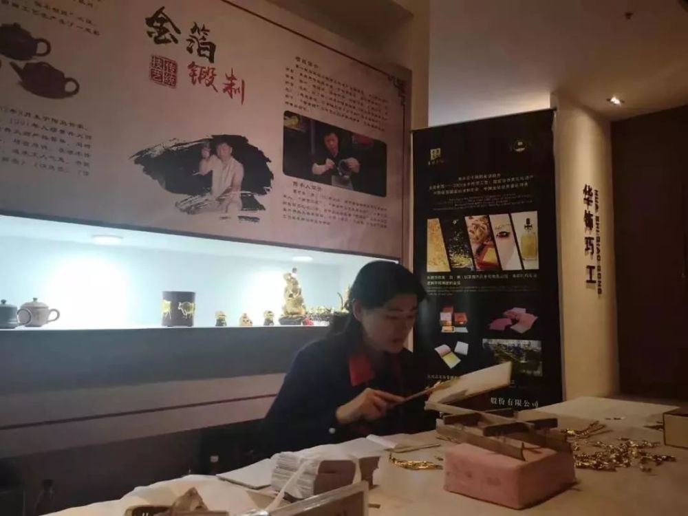 南京金箔由真金经倒条、下条、拍叶等十多道工序锤炼而成。据传承人葛才金介绍,其中打箔最为辛苦,须把一块金“疙瘩”打成0.1微米左右的薄片。两个人面对面打,要打上万次。那么,打制成的金箔到底有多厚呢?葛才金卖了个关子,“943张金箔厚仅一毫米,一万张金箔重仅178.125克,技艺之精可见一斑。”围观观众发出阵阵感叹。