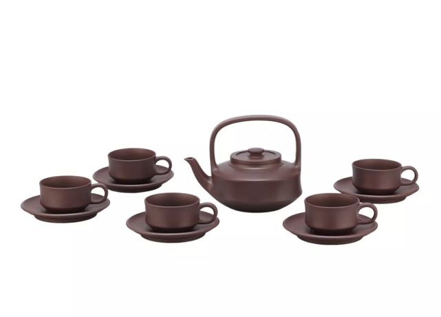 1955年左右,顾景舟创制花货巨制十头松鼠葡萄咖啡茶具。2015年11月19日,在北京东正拍卖会“献礼”专场,全场只拍卖这一套紫砂作品,以8000万落槌,如果加计15%的拥金,最终成交价为9200万元。