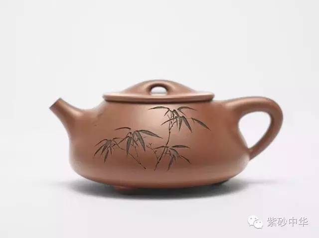 此壶为石瓢式, 阔口、短直流、环状柄。壶身一面刻诗文“无客尽日静,有风终夜凉。药城兄属。吴倩并题”;另一面刻 竹叶,书款“湖帆”。此壶器型敦厚古朴、气韵 深沉;书法若游云惊龙,银钩铁 画、笔底春风;竹枝图灵动传情、 刻工利落稳健。诗画相衬、美不 胜收,烟光日影露气,皆浮动于疎枝密叶之间。 竹为花中君子,欺霜傲雪,文士风骨。此壶工艺精湛、色泽 古雅,颇显文人雅趣,一如景舟 先生本人,襟怀若谷、卓尔不群。百世垂范不足道, 一蓑烟 雨任平生。