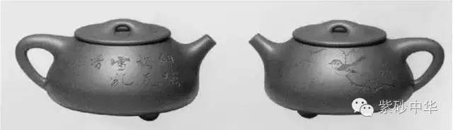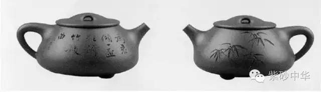 1948年,顾景舟34岁,正值壮岁。他精心制作了五把大石瓢壶,壶坯轻舟运沪,经上海铁画轩第二代传人戴相明携壶坯,随江寒汀到吴湖帆家中,请为五壶做书画装饰。吴湖帆欣然应允,在五把壶坯上题诗两句,四把壶上各画“风动疏竹”,第五把则由江寒汀题孤雀寒梅。书画成,仍由戴相明交货船带送顾家,并由顾景舟亲自镌刻。