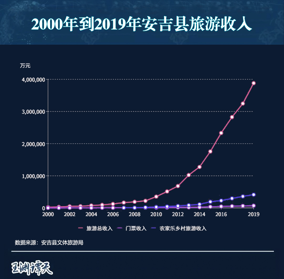 通过安吉县文体旅游局,谭主也拿到一份数据,从2005年至今安吉县旅游收入翻了40倍之多。2019年,安吉县旅游收入占农民收入的20.34%。