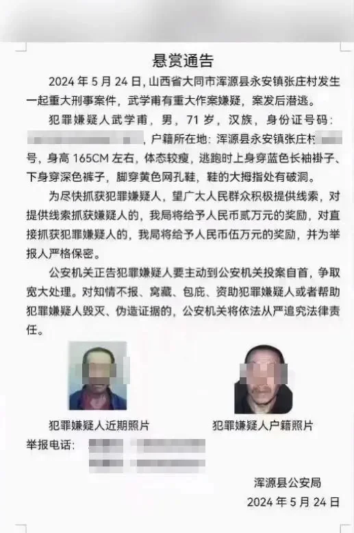 5月25日晚,山西省大同市浑源县公安局发布警情通报称,该县永安镇张庄村24日发生的重大刑事案件涉案嫌疑人武某某,已于25日上午10时被抓获。此前,警方曾发布悬赏公告。