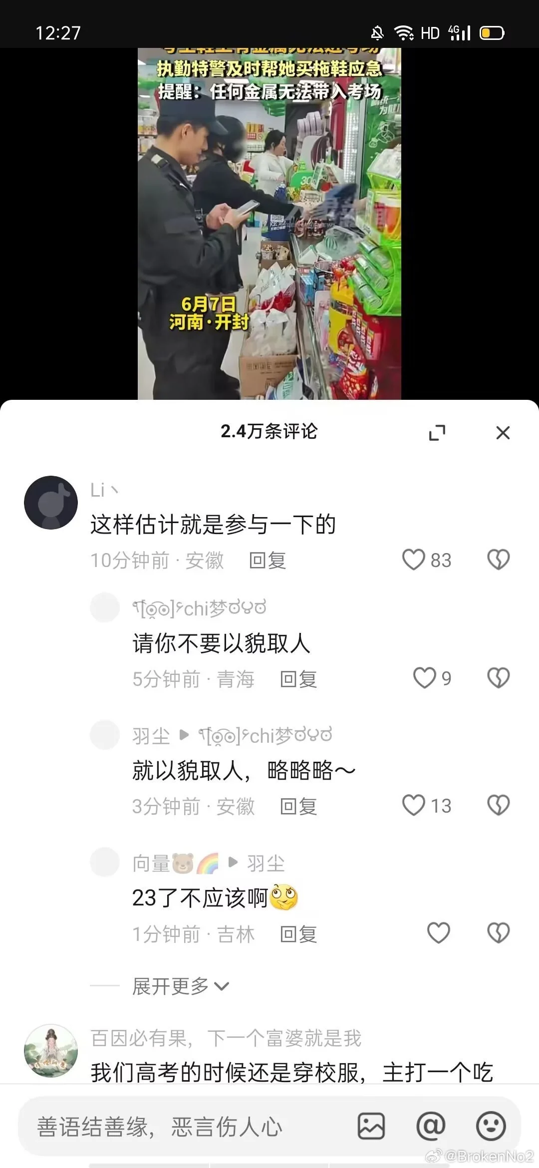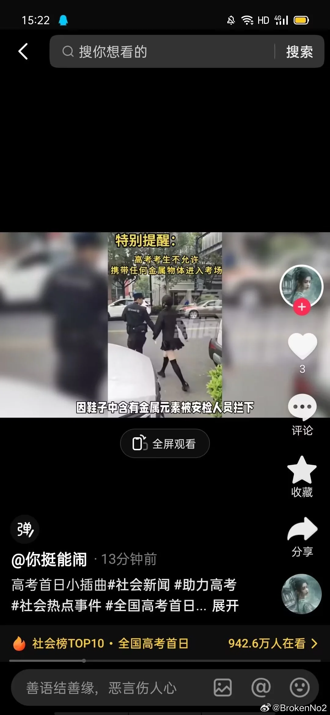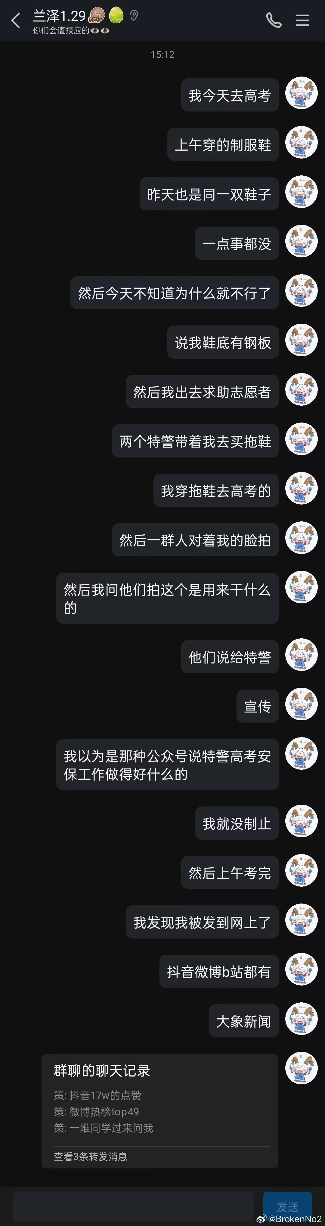 从下午场开始考试前就已经报警联系媒体删视频 到开考前半小时才删除了b站抖音微博平台的事情 当时热度已经17w点赞 plq对我的辱骂数不胜数 直到今天下午五点到六点仍在陆陆续续收到同学的消息 甚至视频号依旧没有删视频 本人已经采取法律措施维护正当权利