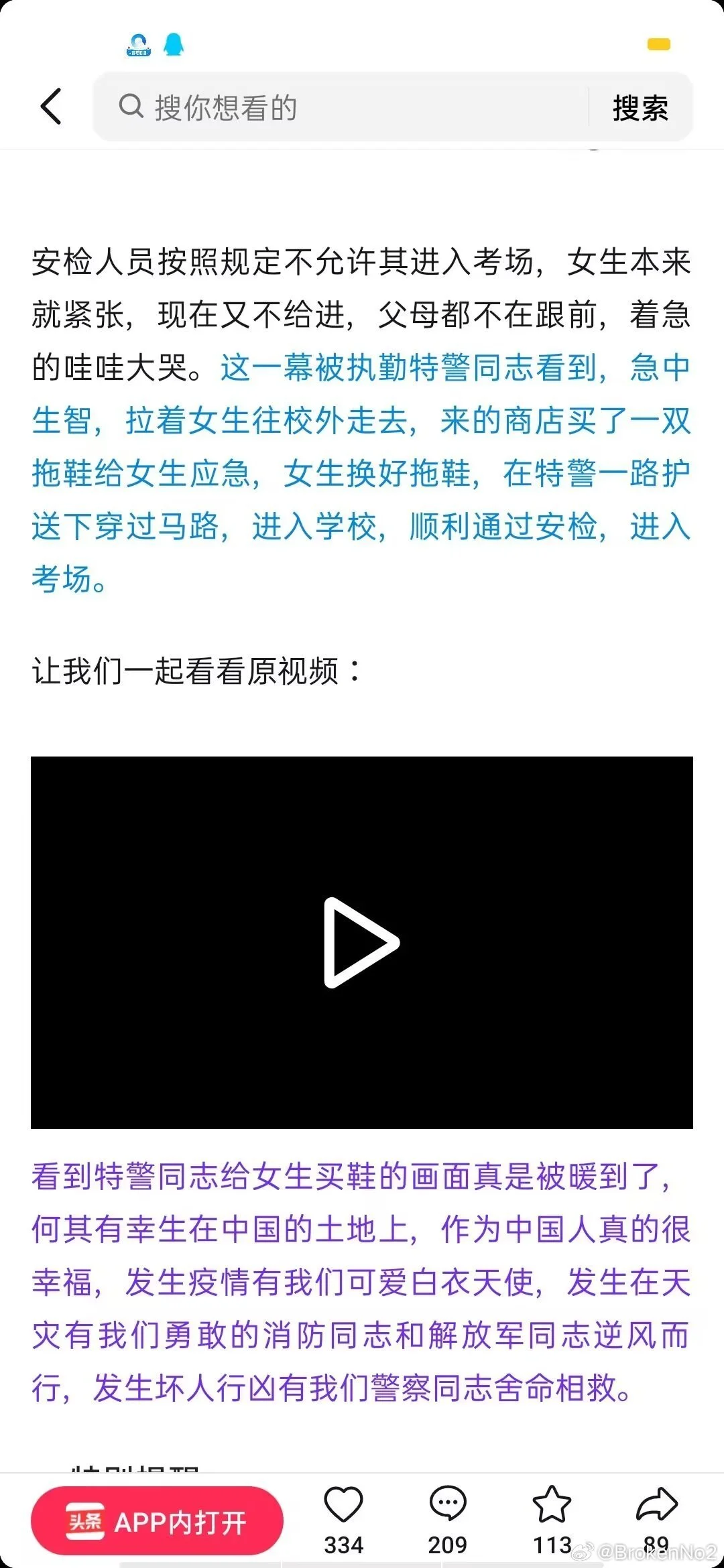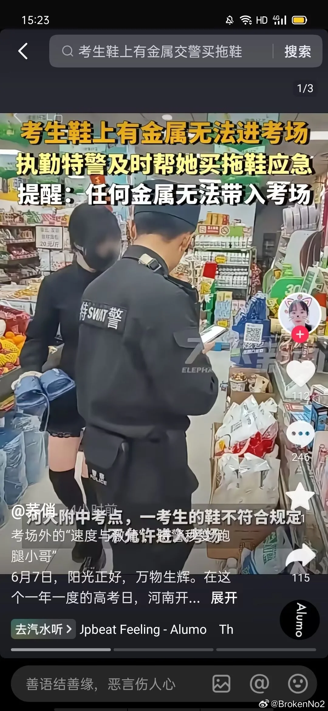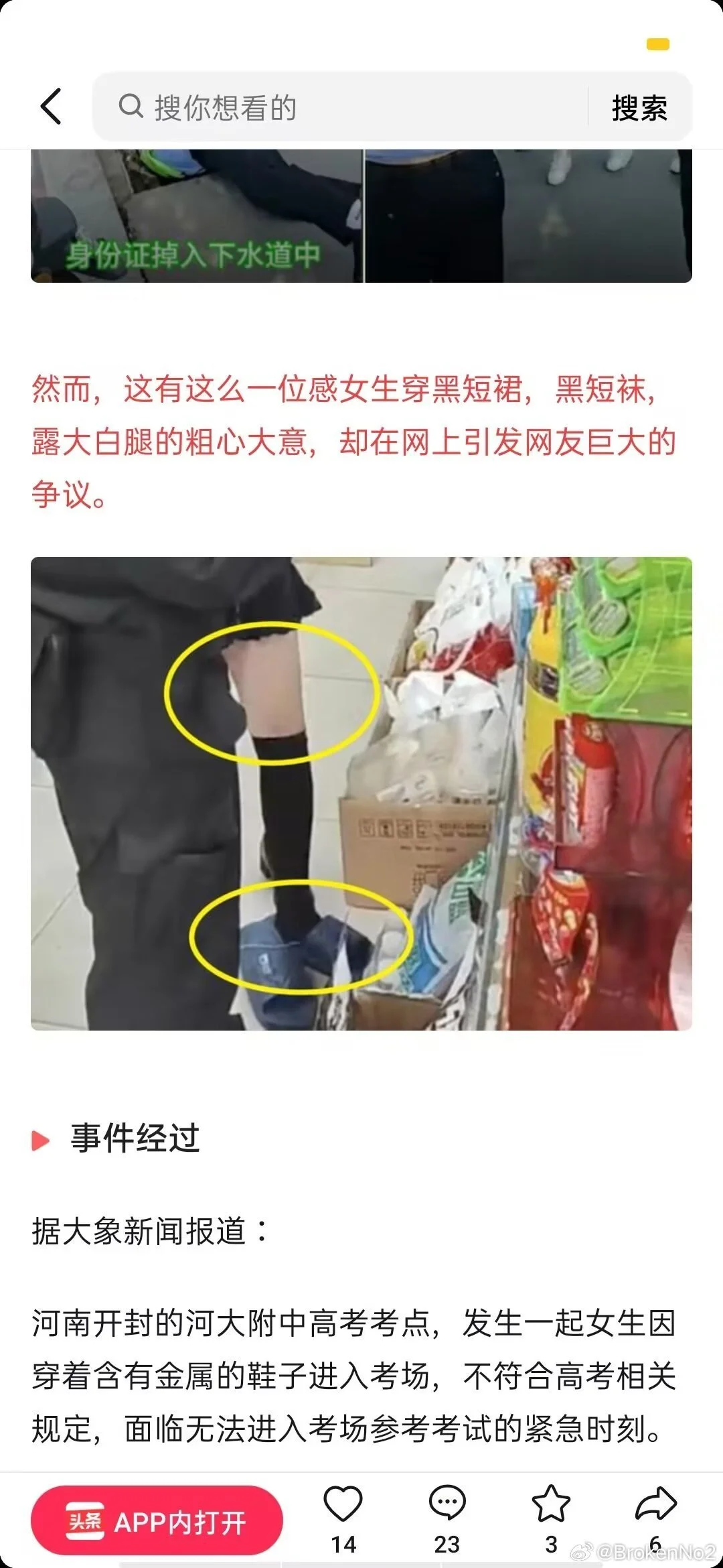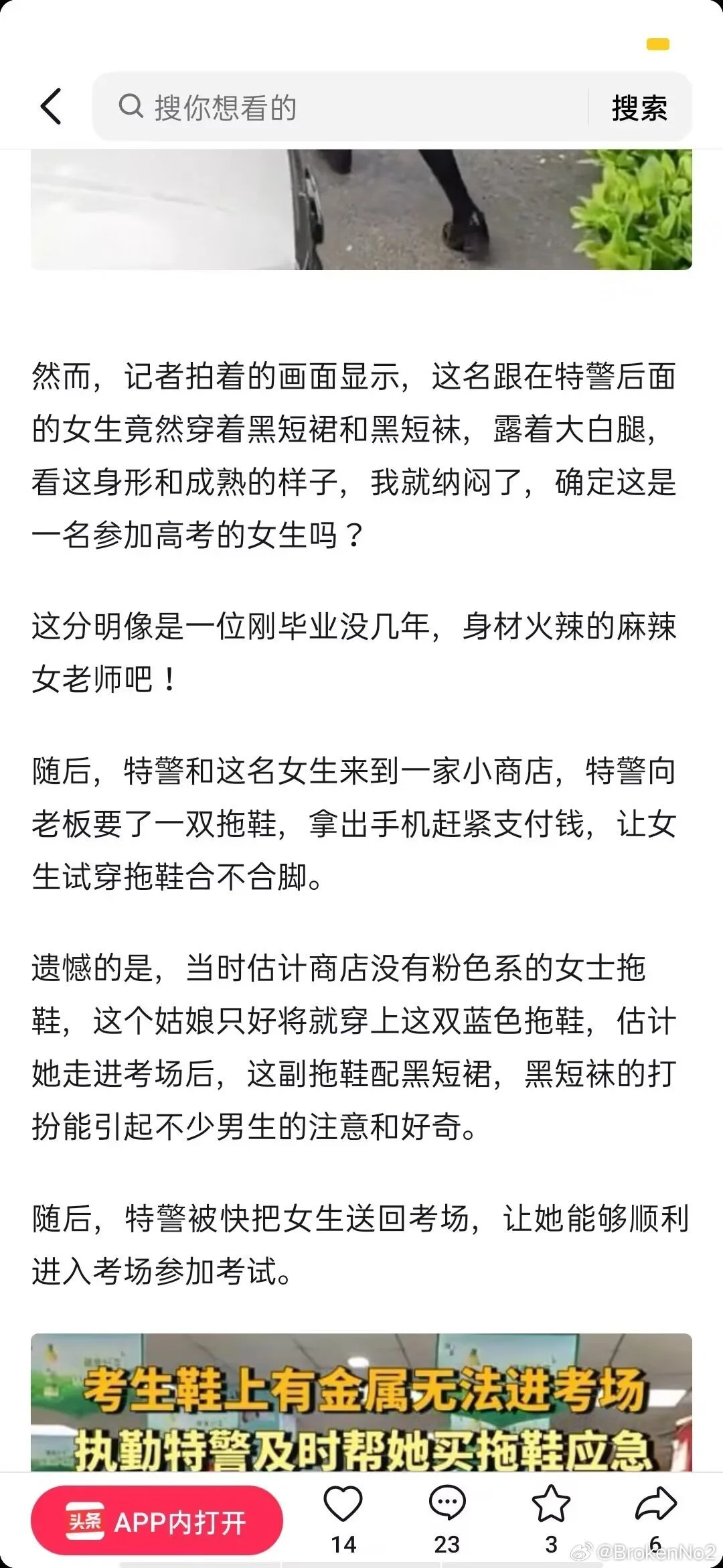 我是今天河南高考鞋子出问题被特警带走买拖鞋进场考试的当事女生 感谢我的朋友为我发声 但是因为原帖被删我这边恢复一些以后还是决定进行补档 另外因为个人承受能力的原因已经不准备接着考试了 大家不要吵架我真的特别感谢你们