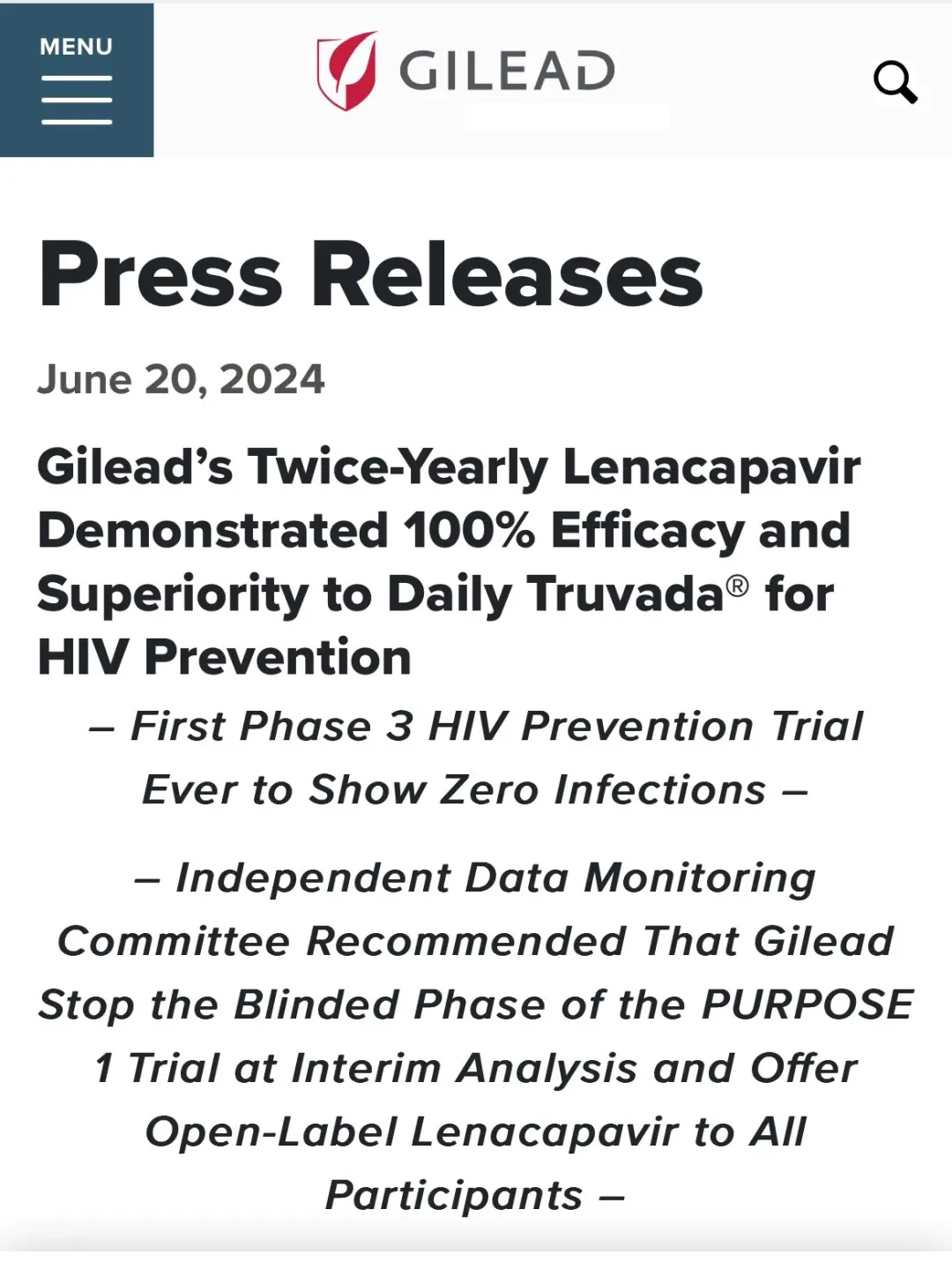 吉利德全球首席医疗官Merdad Parsey在声明中称:一年两针的Lenacapavir具有零感染率和100%的疗效,这证明了其作为预防HIV感染重要新工具的潜力。