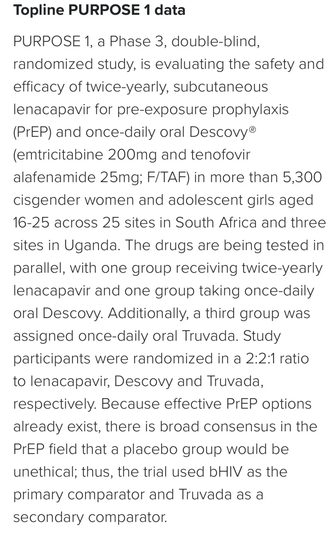 目前PURPOSE 1是中期数据分析,最终结果还需要更长时间的分析。但由于目前展示出来的出色有效性,独立数据监测委员会已经建议吉利德停止双盲法(临床对照),向所有参加临床试验的女性志愿者提供Lenacapavir。