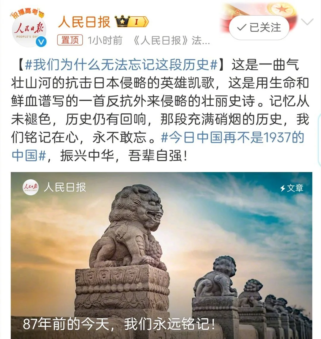 今天中国人对卢沟桥事变的最好回答就是,中国经济规模已经是日本的3倍多,而且我们是核大国,有自己的北斗系统,中国人正在走向月球;中国电动车越来越强,中国全境布满高铁和高速路……