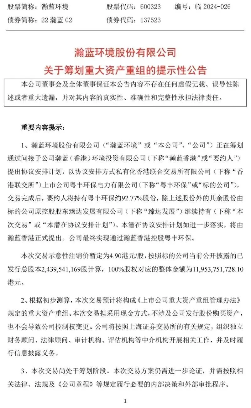 7月7日晚间,瀚蓝环境披露关于筹划重大资产重组的公告称,公司正在筹划通过间接子公司瀚蓝(香港)环境投资有限公司以协议安排方式私有化收购香港联交所上市公司粤丰环保,收购金额约为119.5亿港元。 此次交易完成后,粤丰环保将成为瀚蓝香港控股子公司,并从香港联交所退市。
