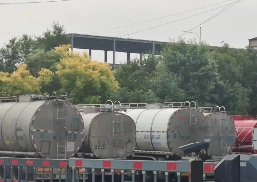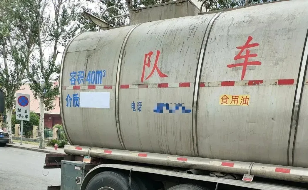 一辆等待进厂运输食用油的罐车,罐体外侧喷涂的介质信息被一张白纸遮盖住,司机重新张贴了一张写有“食用油”字样的纸条