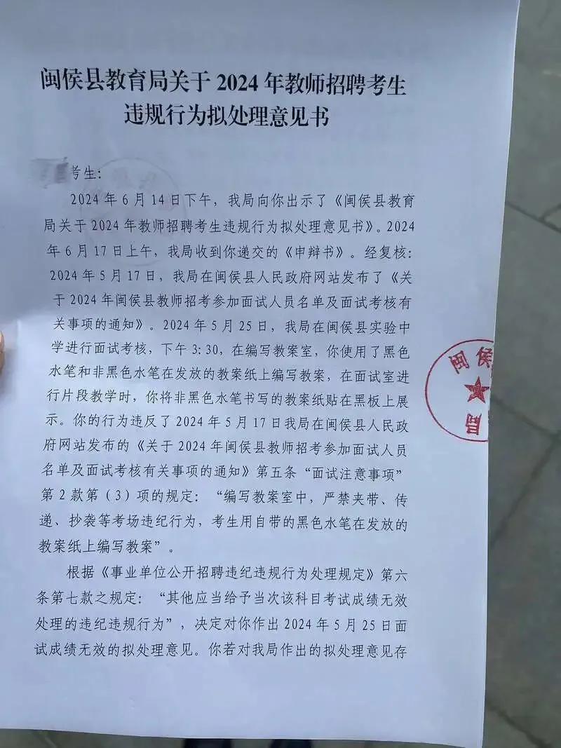 6月14日,闽侯县教育局向林女士开具了一份加盖公章的“拟处理意见书”。闽侯县教育局认为,林女士在面试中的行为违反《关于2024年闽侯县教师招考参加面试人员名单及面试考核有关事项的通知》中的规定,根据《事业单位公开招聘违纪违规行为处理规定》第六条,闽侯县教育局拟对林女士作出5月25日面试成绩无效的处理。