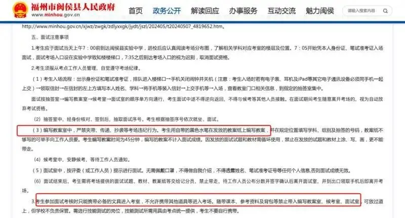 闽侯县教育局认为,林女士使用黑色和非黑色水笔在发放的教案纸上编写教案,在面试室进行片段教学时,将非黑色水笔书写的教案纸贴在黑板上展示,违反了2024年5月17日闽侯县教育局在闽侯县人民政府网站发布的《关于2024年闽侯县教师招考参加面试人员名单及面试考核有关事项的通知》(以下简称《面试考核通知》)第五条“面试注意事项”第2款第(3)项的规定:“编写教案室中,严禁夹带、传递、抄袭等考场违纪行为,考生用自带的黑色水笔在发放的教案纸上编写教案”。