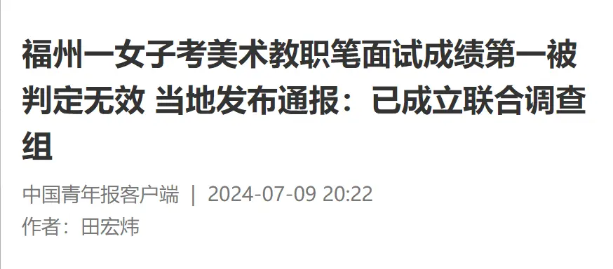 近日,福建一女子报考福州闽侯十邑廷坪希望中学初中美术教师岗位,笔、面试成绩均第一被判无效一事引起网民关注。
