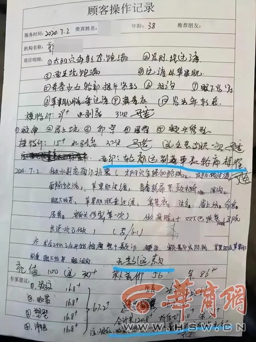 李女士提供的一份操作记录上显示,面部:轮廓达到董事长轮廓标准、无效退款。颈纹、收紧、塑性,以董事长的标准做。后还有机构董事长的签字。