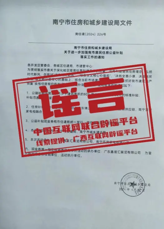 真相:近日,广西南宁市住房和城乡建设局接到群众反映,有不法分子冒用南宁市住房和城乡建设局名义伪造机关公文和印章,发布所谓“南宁将发放住房公益补贴”的通知,造成恶劣影响。对此,南宁市住房和城乡建设局发布声明称,南宁市住房和城乡建设局从未出具《南宁市住房和城乡建设局关于进一步加强我市住房公益补贴落实工作的通知》。同时提醒,请接到此伪造文件的单位和个人,提高警惕,谨防上当受骗。若已因此遭受财产损失的,请及时向公安机关报案。(来源:“广西互联网违法和不良信息举报”微信公众号、南宁市住房和城乡建设局)