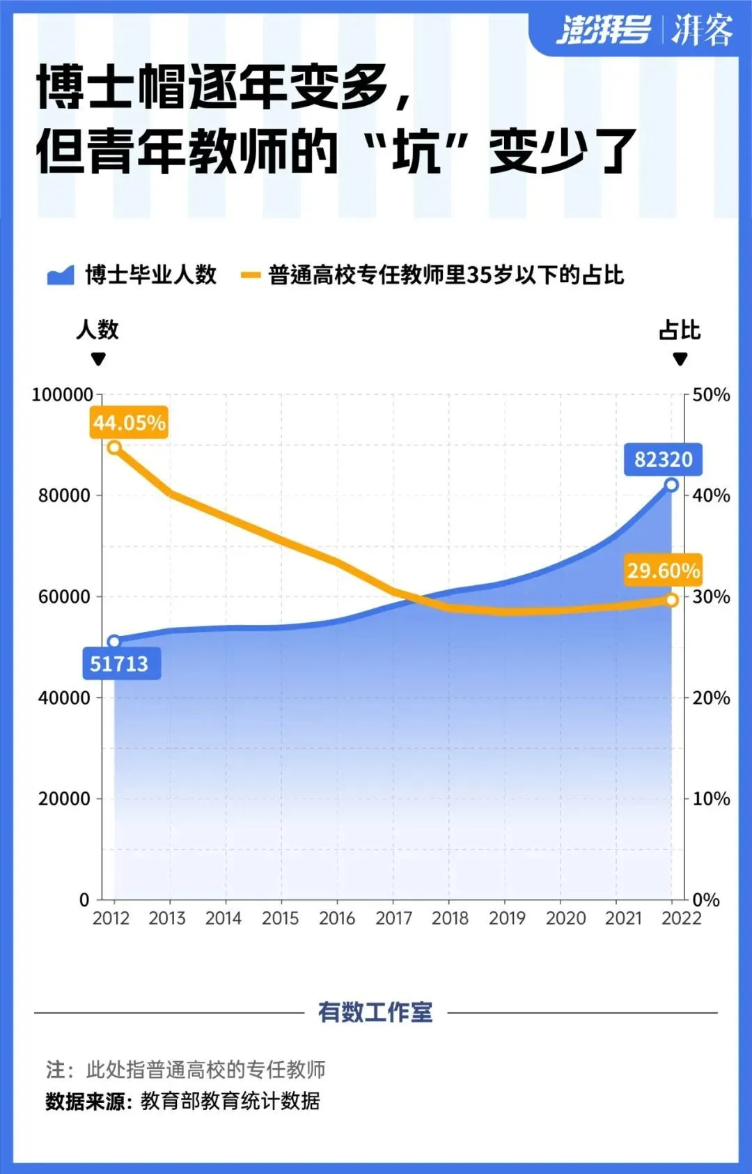 起伏的统计数字背后,博士逐渐缺少稀有价值,却要竞争越来越有限的“坑位”——普通高校里,35 岁以下的年轻专任教师占比从 2012 年的 44.05%,降到了 2022 年的 29.6%。