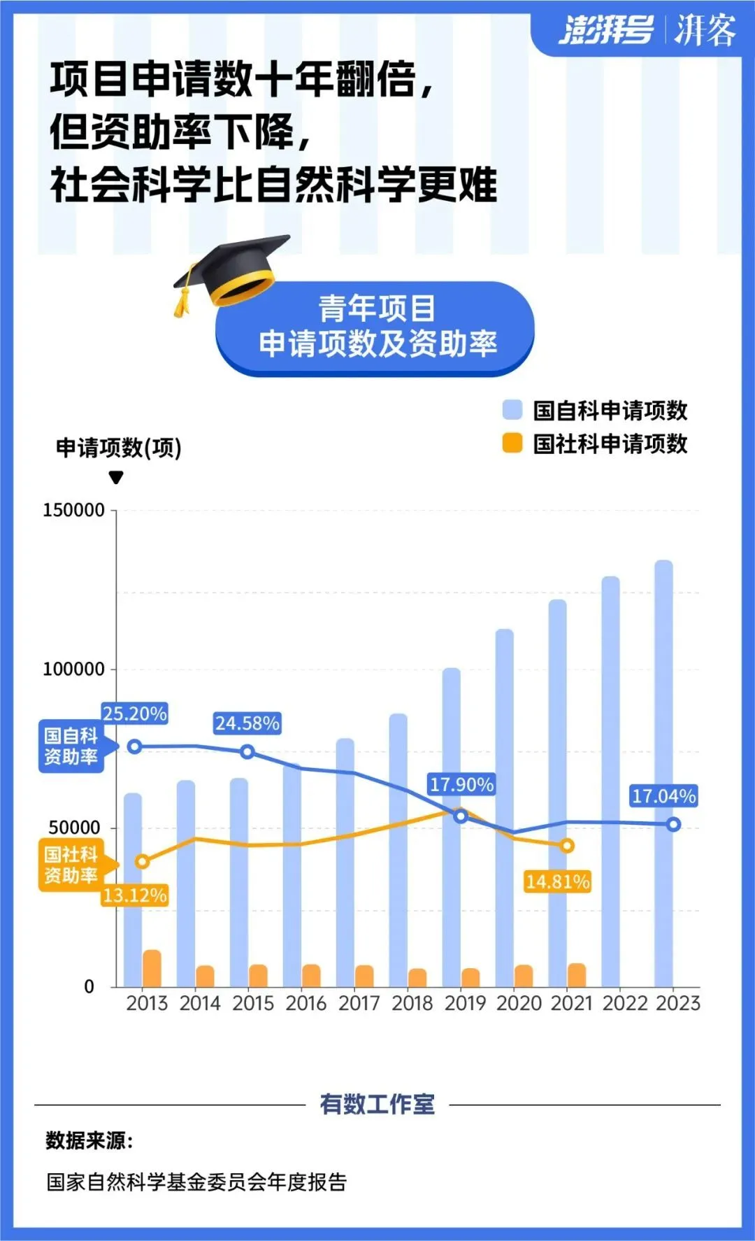 年龄门槛之外,更令青年教师们发愁的是青年项目的申请难度逐年增长——参与竞争青年项目的数量从十年前不到 6 万,涨到了如今的 13 万。但资助率始终没有超出 30%,从 25% 上下滑落到了 17.04%。国家自然科学基金委员会 2022 年度报告将“持续降低的资助率”列为了基金绩效的主要问题之一。