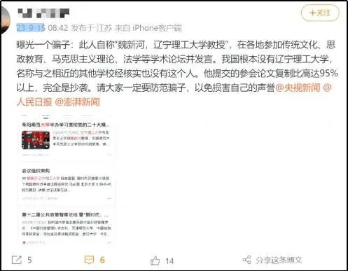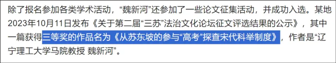 有的人会为当上学术妲己沾沾自喜,而魏新河已经化身成学术章总了。