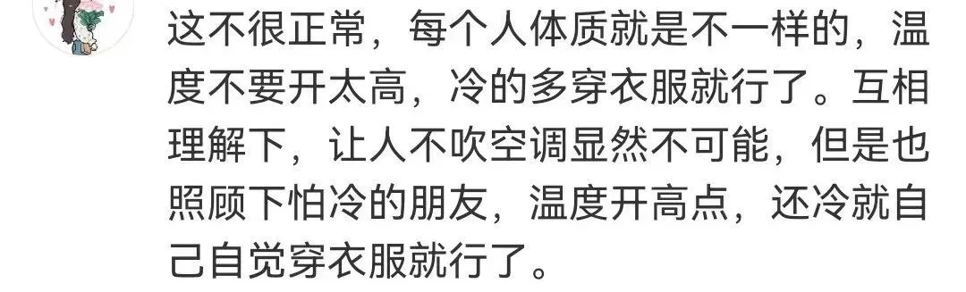 每次我开空调,还要阴阳我说年轻就是火气大。我真的是无语,三伏天开28度还冷,到底是什么体质啊!!!我有时候觉得冷,就自己披个小毛毯啊,老要求别人干嘛啊,现在还不开空调不是与自然为敌吗?现在有时候搞得我都觉得是不是我的问题了。