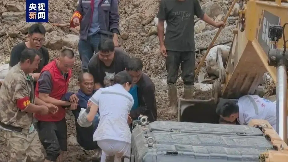 图片显示,在新华村,一些工程车在受灾现场施工,救援人员在周边搜救。