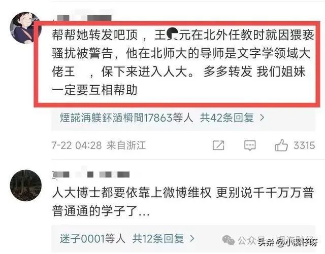 其实这也不是王贵元第一次身陷风波了,据知情网友透露,其之前在北京一所大学,也是有过类似的骚扰猥亵学生的事情发生,还被学校停职处理,之后疏通关系才到了人民大学任教。