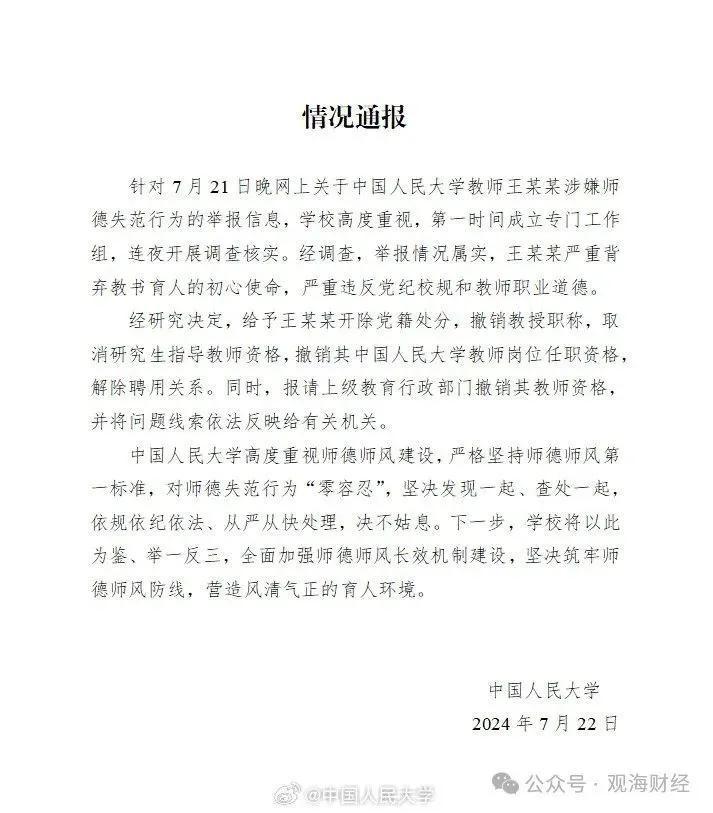 针对7月21日晚网上关于中国人民大学教师王某某涉嫌师德失范行为的举报信息,学校高度重视,第一时间成立专门工作组,连夜开展调查核实。经调查,举报情况属实,王某某严重背弃教书育人的初心使命,严重违反党纪校规和教师职业道德。