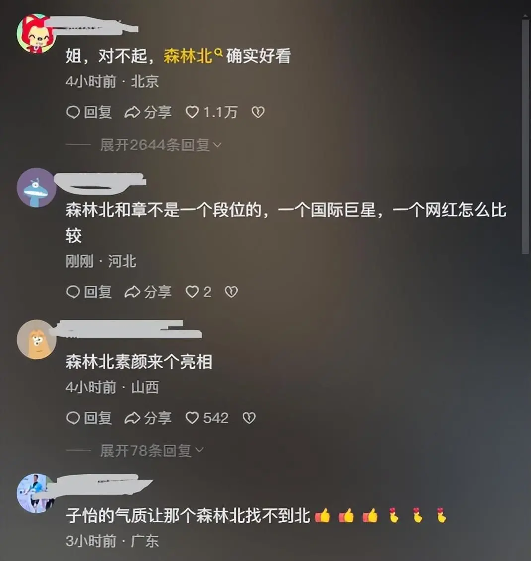 而且下方的几个热门评论,都是在讲森林北在讲章子怡,除了第1位网友之外,其他的网友评论都认为,章子怡的形象气质完胜森林北。