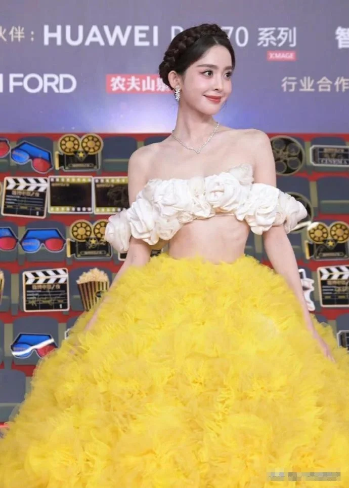 六月份在上海举办的电影之夜上,她穿着一条白黄拼接的花朵裙,抹胸设计露出来的腰部和背部都能看到肋骨和脊梁骨了。