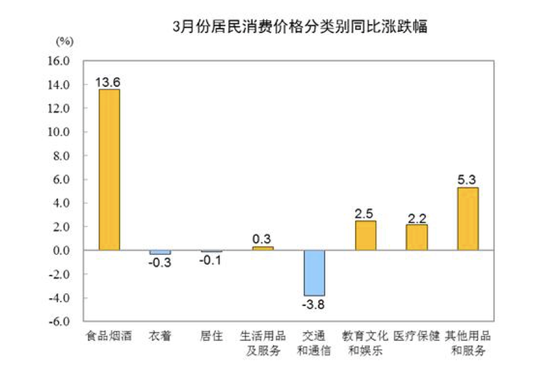 官方的数据显示,3月全国居民消费价格同比上涨4.3%,未延续前两个月5%以上的增长,涨幅较上月回落0.9个百分点。引发关注的是,“居住CPI”出现10年来的首次同比下滑,环比来看,食品烟酒下降、房租在降、衣服在降、生活服务用品在降、交通出行也在降。
