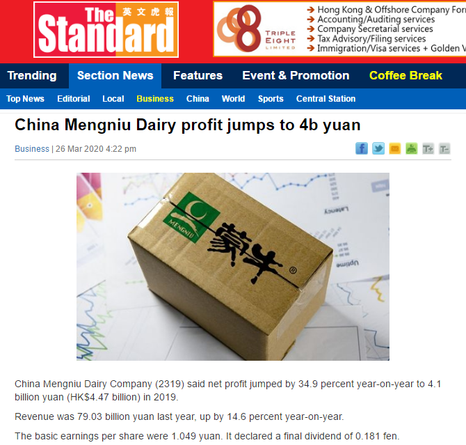 3月26日,蒙牛乳业(02319.HK)发布2019年的财报显示,公司营业收入达790亿元,净利润达41亿元,增速引领行业。在2019年国内外经济压力和不确定性提升的情况下,蒙牛作为行业领军企业能够取得超预期增长,引起了各界高度关注。特别是自去年接连收购贝拉米和LDD,让许多海外媒体对蒙牛产生了浓厚兴趣。除了报道出色业绩外,他们也对蒙牛自疫情发生以来积极复工复产、创新业务化危为机的行动频频点赞。