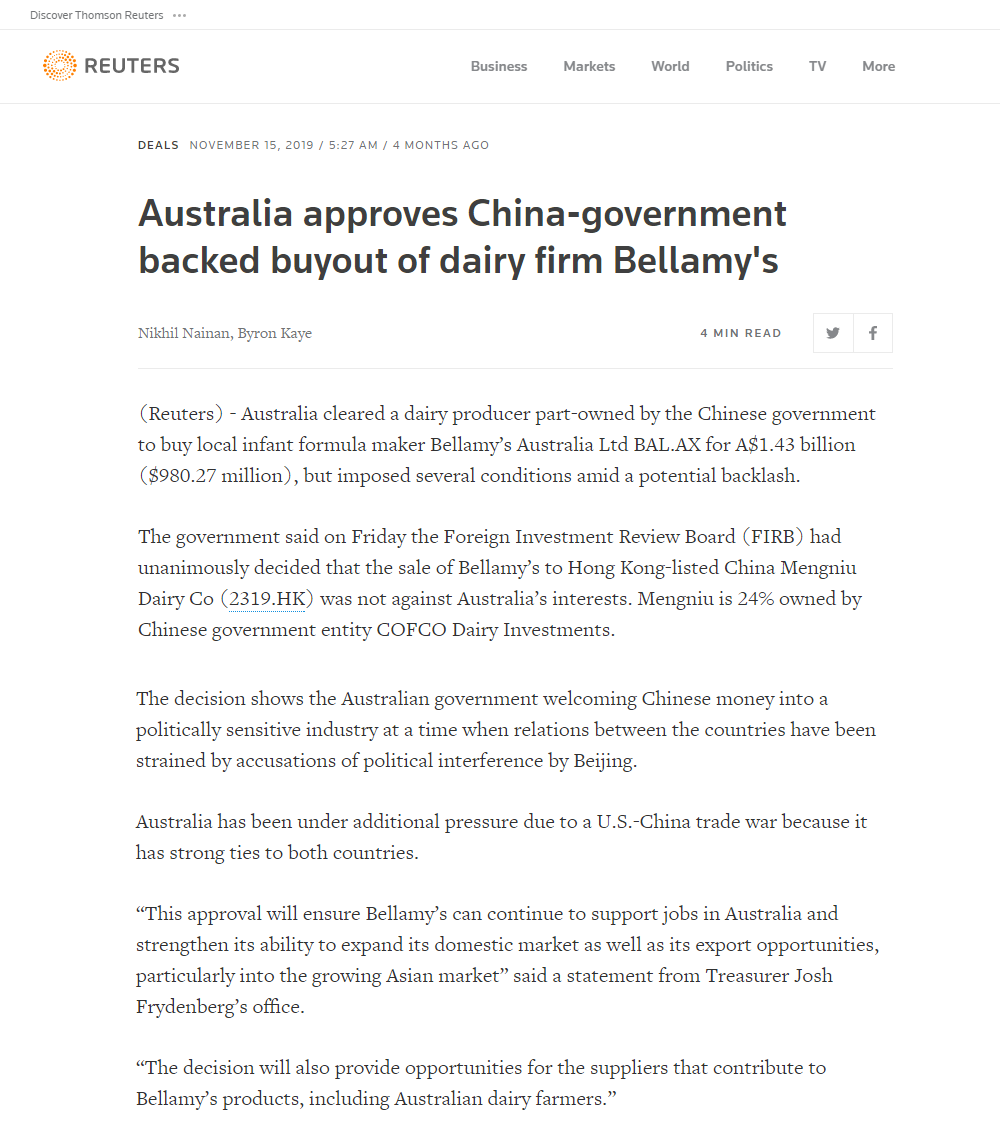 2019年在蒙牛国际化战略中具有标志性意义,通过与澳大利亚领先的有机婴儿配方奶粉和婴儿食品供应商贝拉米和澳大利亚乳饮料公司LDD的协同合作,蒙牛进一步完善了乳业全球价值链。对此,路透社在报道中提到,澳大利亚财政部长乔什弗莱登堡办公室的一份声明表示,蒙牛对贝拉米的收购将能够确保贝拉米能够继续支持澳大利亚的就业,并加强其扩大国内市场和出口机会的能力,特别是进入不断增长的亚洲市场的能力,这一决定还将为贝拉米产品的供应商与澳大利亚奶农提供更多机会。