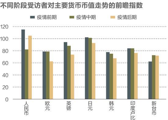 折算成对主要货币升值的信心指数(同样为100表示持平,超过100表示升值预期大,低于100表示贬值预期强),并进行分阶段分析可发现,受访者对人民币币值走势的判断呈先贬值后升值的变化,这主要是由于国内疫情防控效果明显。类似地,日元、韩元、印度卢比和新台币在疫情不同阶段的变化幅度较小,与这几个国家或地区的防疫相对较为成功有关。对欧元和英镑预期下跌的判断也体现了对这些国家或地区疫情防控形势紧张的担心。