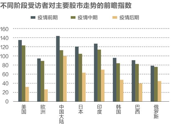 对2020年各国股市发展前景的判断也各不相同,受访者对除中国大陆外的其他国家股市均持较谨慎态度。在疫情的前期和中期,受访者对美国、中国大陆、日本和印度的股市普遍持相对乐观态度。在疫情中期,对这4个国家看涨较看跌的比重分别高21.5、11.0、3.0和12.2个百分点。相应地股市信心指数分别为122、111、103和112。而到了疫情后期,除中国大陆外,对各主要股市均以看跌为主。其中对美国和欧洲看跌的受访者比重高达79.2%和77.6%,对韩国、巴西和俄罗斯看跌的受访者比重也都超过一半,分别达到57.8%、65.7%和62.7%,日本和印度略好,但看跌的受访者比重也达到42.9%和44.1%,看涨的受访者仅为4.3%和12.2%。大多数受访者对中国大陆的股市表现出相对乐观的态度,这与中国股市处于相对低位、中国早先一步控制住了疫情,在全球经济增长中处于相对有利的位置,以及中国股市与经济基本面的相关性较低有关。