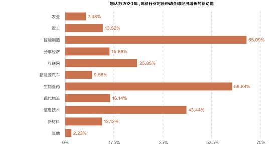 智能制造、生物医药和信息技术被认为是最有可能带动全球经济增长、最有发展潜力的新动能。在新能源汽车、现代物流、新材料、智能制造、共享经济等11个行业中,被受访者认为最能带动全球经济增长的行业分别是智能制造、生物医药和信息技术(选择相应选项的受访者占比分别是65.1%、59.8%和43.4%),列在第4位的是互联网,而排在后几位的则分别是农业、新能源汽车和新材料。对这些产业发展前景的看法,既体现了产业发展的长期趋势,也反映了疫情中各产业发展的短期影响。智能制造和信息技术,以及“互联网+”一直是近几年全球各国发展较快的领域;在疫情冲击下,随着人员流动受阻,智能制造和互联网这类有助于减少对现场办公或者人员需求的技术无疑体现出了更大的发展前景,而生物医药领域更是出现了爆发式的增长。与此相反,新能源汽车和新材料等行业虽然也有巨大的潜能,但经过多年的发展暂时进入了较平稳的阶段,而新材料也有赖于持续的技术研发和投入,短期内难有大的、突破性的进展。